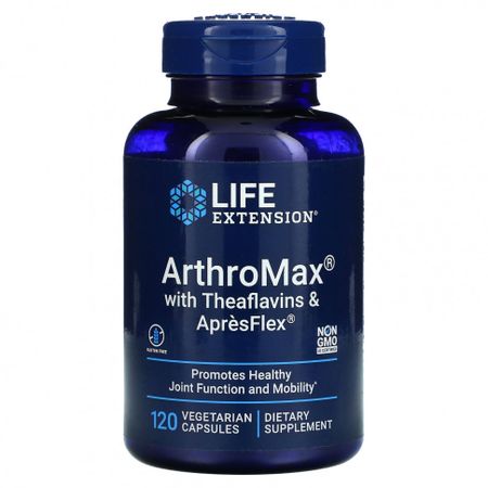 [стд. до 20% 3-0-ацетил-11-кето-B-босвеллиевой кислоты (AKBA)]100 мг**Бор (фруктоборат кальция в виде запатентованного комплекса Fruitex B® OsteoBoron®)1,5 мг**** Суточная норма не определена. Без глютена Отсутствие ГМО в составе подтверждено сертификатом Non GMO LE CertifiedСпособствует здоровью суставов и двигательной функцииПищевая добавкаТеафлавины черного чая, МСМ (метилсульфонилметан), индийский ладан Apr?sFlex® (Boswellia serrata), глюкозамин и бор различным образом поддерживают здоровье и подвижность суставов. И все они включены в комплекс «ArthroMax®, Apr?sFlex® и теафлавины» — веганскую добавку для здоровья суставов, разработанную на основании научных исследований.Соединения теафлавина, полученные из черного чая (Camellia sinensis), помогают защищать суставы от окислительного стресса.Преимущества добавки «ArthroMax®, Apr?sFlex® и теафлавины»Способствует нормальной работе суставов Подавляет воспалительные факторы, называемые цитокинами, стимулируя здоровую воспалительную реакцию. Содержит клинически изученные ингредиенты для обеспечения комфорта коленного суставаArthroMax®: Для здоровых суставов и кожи в пожилом возрастеСтарение и нормальный износ могут повлиять на здоровье и функции суставов. Но вы можете внести свой вклад в длительное сохранение здоровья суставов, принимая специально разработанные пищевые добавки от Life Extension®. Мы создали множество средств, поддерживающих здоровье и подвижность суставов, лучшие из которых носят название линии продуктов ArthroMax®. Каждое из них имеет уникальный состав ингредиентов, способствующих здоровью, комфорту и подвижности суставов!Экстракт босвеллии Apr?sFlex® boswellia. Этот растительный экстракт подавляет воспалительные факторы, в частности, фермент 5-LOX и лейкотриен B4, для поддержания здоровья суставов. Как показывают исследования, соединения, содержащиеся в босвеллии, напрямую связываются с ферментом 5-LOX. В плацебо-контролируемом клиническом исследовании дискомфорт в суставах уменьшался при употреблении экстракта босвеллии в течение всего 8 недель.В рандомизированных контролируемых клинических испытаниях глюкозамина и бора было показано, что глюкозамин поддерживает структурную основу суставной и хрящевой ткани и способствует их здоровью. ArthroMax® также содержит бор — микроэлемент, критически необходимый для здоровья костей и суставов.МСМ (метилсульфонилметан) в сочетании с глюкозамином и босвеллиевой кислотой показал отличные результаты в поддержании комфортного состояния и работы коленного сустава в клинических испытания…