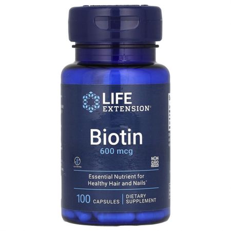 Пищевая ценностьРазмер порции: 1 капсула Количество в 1 порции% от суточной нормыБиотин600 мкг2000% Не содержит глютенаОтсутствие ГМО в составе подтверждено сертификатом Non GMO LE CertifiedПитательное вещество, необходимое для здоровья волос и ногтейПищевая добавкаБиотин — это водорастворимый витамин, принадлежащий к семейству витаминов группы B. Он необходим для производства кератина, белка, который является структурным компонентом волос, ногтей и кожи.С возрастом организм производит меньше структурных белков, необходимых для поддержания здоровья волос, кожи и ногтей. Биотин помогает производить кератин, один из этих важных белков.Биотин необходим для здоровья кожи, волос и ногтей. Он поддерживает здоровье волос и ногтей у людей с дефицитом.Преимущества биотина Поддерживает здоровье волос, кожи и ногтейНеобходим для выработки энергии на клеточном уровнеСпособствует экспрессии здоровых геновБиотин, иногда называемый витамином B7, является членом семейства водорастворимых B-комплексов, обычно необходимых лишь в небольших количествах.Биотин используется в организме в качестве кофактора, поддерживая активность ферментов, участвующих в синтезе жирных кислот, глюконеогенезе (образовании глюкозы из не углеводных источников) и распаде аминокислот. Биотин также необходим для производства клеточной энергии в качестве кофактора для ферментов цикла ЦТК, или цикла Кребса.Все больше данных свидетельствует о том, что биотин может играть важную роль в экспрессии генов. Биотин необходим для производства протеина кератина и, следовательно, поддерживает здоровье волос, кожи и ногтей.Важно отметить, что добавки биотина могут искажать результаты определенных гормональных исследований и других лабораторных тестов. Обязательно проконсультируйтесь со своим врачом, если вы принимаете дополнительный биотин и вам нужно сдать лабораторные анализы.