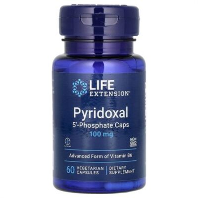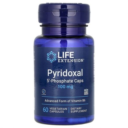 Пищевая ценностьРазмер порции: 1 вегетарианская капсула Количество в 1 порции% от суточной нормыВитамин В6 (в виде пиридоксаль 5’-фосфата)100 мг5882% Улучшенная форма витамина B6Не содержит глютена Отсутствие ГМО в составе подтверждено сертификатом Non GMO LE CertifiedПищевая добавкаВитамин B6 играет важную роль во многих жизненных процессах организма. Пиридоксаль-5′-фосфат, метаболически активная форма витамина B6, участвует в более чем 100 ферментативных реакциях в организме.Обзор Пиридоксаль 5?-фосфат — метаболически активная форма витамина B6. Он играет важную роль во многих жизненных процессах организма и защищает липиды и белки от реакций гликирования. Подавляя эти реакции и работая как кофермент в биохимических реакциях, пиридоксаль-5′-фосфат поддерживает здоровье нервной системы, глаз, сердечно-сосудистой системы и почек.Витамин B6 защищает от реакций гликирования, что может положительно повлиять на многие аспекты здоровья.Преимущества витамина B6Помогает подавить реакции гликации Способствует здоровью сердца, нервов и глаз Поддерживает здоровую функцию почекЗащищает от гликированияВитамин B6 играет важную роль во многих жизненных процессах. Пиридоксаль 5′-фосфат является метаболически активной формой витамина B6, которая, как было показано, защищает липиды и белки от реакций гликирования, тем самым поддерживая здоровье нервной и сердечно-сосудистой систем, здоровый иммунитет и многое другое.Информация о продукте Витамин B6 играет важную роль во многих жизненных процессах. Пиридоксаль-5′-фосфат, метаболически активная форма витамина B6, участвует в более чем 100 ферментативных реакциях в организме.Было выявлено, что пиридоксаль 5′-фосфат защищает липиды и белки от реакций гликирования. Реакции гликирования возникают, когда сахар в крови вступает в реакцию с белками и липидами в организме. Эти реакции являются естественным следствием старения и приводят к образованию конечных продуктов гликирования (КПГ) по всему телу. КПГ со временем накапливаются и способствуют некоторым признакам старения. Предотвращение образования КПГ поможет поддержать многие аспекты вашего здоровья.Подавляя образования КПГ и работая как кофермент в биохимических реакциях, пиридоксаль-5′-фосфат поддерживает здоровье нервной и сердечно-сосудистой систем, глаз и почек, а также здоровый иммунитет.В дополнение к этому отдельному продукту компания Life Extension предлагает пиридоксаль-5′-фосфат в двух основных составах: Life Extension Mix™ и средство для оптимизации энергии митохондрий с пирролохинолинхиноном (PQQ).