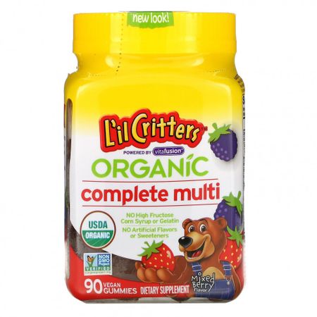 ** Суточная норма не определена. Содержит Vitafusion™Сертификат USDA OrganicСертификат Non GMO Project VerifiedНе содержит кукурузного сиропа с высоким содержанием фруктозы и желатинаИскусственных ароматизаторов и подсластителейПищевая добавкаСамый популярный бренд витаминов в виде жевательных мармеладок в АмерикеОрганическое происхождение продукта подтверждено организацией Quality Assurance International (QAI).Органические жевательные витамины L’il Critters™ эффективные и полезные. Эти жевательные таблетки без желатина, состоящие из незаменимых питательных веществ и лучших органических ингредиентов, обеспечивают восхитительное питание, от которого вы будете чувствовать себя хорошо.Поддерживает здоровый рост и развитие ребенка.Витамин D для поддержки усвоения кальция в костях и зубах.Витамин C и цинк для поддержки иммунной системы.Без синтетических красителей [FD&C].