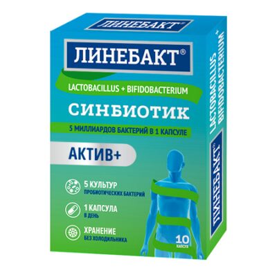 Линебакт Актив + — современный препарат биологического происхождения, в одной капсуле содержится 5 миллиардов лактобактерий и бифидобактерий, а также инулин и олигофруктоза. Бифидобактерии: • способствуют пищеварению, участвуя в утилизации пищевых субстратов и активизации пристеночного пищеварения; • осуществляют путем ассоциации со слизистой оболочкой кишечника физиологическую защиту кишечного барьера от проникновения микробов и токсинов во внутреннюю среду организма; • обладают высокой антагонистической активностью по отношению к патогенным и условно патогенным микроорганизмам за счет выработки органических жирных кислот; • синтезируют: пантотеновую, молочную, уксусную, янтарную, муравьиную, фолиевую кислоты, что снижает рН среды кишечника и препятствует колонизации его посторонними микробами, попавшими извне, а также витамины; В1, В2, В3, В6, С, D, E, К; • способствует усилению процессов всасывания через стенки кишечника ионов кальция, железа, витамина D, воды и газов, инактивации гистамина. Из модифицированных бактериальной флорой вторичных нутриентов (балластных веществ) способна образовывать незаменимые аминокислоты, жиры, белки и углеводы, обеспечивая таким образом трофический гомеостаз (трофостат).1 Лактобактерии в процессе жизнедеятельности образуют антибиотические вещества: лактолин, лактоцидин, ацидофилин и вступая в сложное взаимодействие с другими микроорганизмами, в результате чего подавляют гнилостные и гноеродные условно патогенные микроорганизмы, в первую очередь протей, а также возбудители острых кишечных инфекций. В процессе нормального метаболизма они способны образовывать молочную кислоту, перекись водорода, продуцировать лизоцим, другие вещества с антибиотической активностью: реутерин, плантарицин, лактолин. Они нейтрализуют некоторые вещества, образующиеся в кишечнике при распаде белка, например гистамин.1 Инулин и олигофруктоза в современном мире являются наиболее используемыми пребиотиками, производимыми в промышленных масштабах водной экстракцией из корня цикория.2 Наряду с непосредственными положительными эффектами (улучшением перистальтики кишечника и состава микрофлоры) инулин и олигофруктоза дают еще целый ряд опосредованных эффектов: укрепление иммунитета, улучшение усвоения важнейших минералов, прежде всего – кальция и магния, подтвержденное на людях разных возрастных категорий, снижение уровня холестерина, триглицеридов крови и даже снижение риска рака кишечника.
