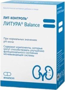 ЛИТ-КОНТРОЛЬ ЛИТУРА BALANCE — Биологически активная добавка (БАД) к пище — способствует улучшению функционального состояния мочевыводящей системы.Рекомендуемый прием (2 капсулы) содержит:Цинк 2,6 мг 17¹% от рекомендуемого уровня суточного потребления¹Магний 110 мг 28¹% от рекомендуемого уровня суточного потребления¹Витамин А 0,3 мг 38¹% от рекомендуемого уровня суточного потребления¹Проантоцианидины 200 мг 200²*% от адекватного уровня потребления в сутки²¹ согласно ТР ТС 022/2011 приложение 2,² согласно «Единым санитарно-эпидемиологическим и гигиеническим требованиям к товарам, подлежащим санитарно-эпидемиологическому надзору (контролю)» (Глава II, раздел 1, Приложение 5).*не превышает верхний допустимый уровеньПищевая и энергетическая ценность на 2 капсулы:9,13 КДж/ 2,19 ккал, жиров — 0,01 г, углеводов — 0,35 г, белка — 0,04 г.Почти каждый пятый человек в мире страдает от мочекаменной болезни (далее МКБ), причём чаще всего страдают мужчины в возрасте 40-50 лет.Среди основных причин, которые приводят к образованию камней, можно выделить: семейную предрасположенность — наличие МКБ у ближайших родственников, ранний дебют камнеобразования, инфекции и другие заболевания мочевыводящих путей, заболевания желудочно-кишечного тракта, гормональные проблемы, прием некоторых видов лекарств.МКБ — это хроническое заболевание.Статистика показывает, что через 3-5 лет после первого эпизода камни снова беспокоят каждого третьего пациента, а через 10 лет каждого второго.А самое главное, что с каждым последующим эпизодом болезни, камни будут появляться все чаще и чаще при наличии факторов риска.Одним из ключевых факторов образования камней является так называемая кислотность мочи (или pH мочи).Очень высокий или очень низкий уровень кислотности увеличивает риск образования камней, особенно если у вас уже были подобные случаи.И наоборот, если поддерживать уровень pH в пределах нормы, то риск образования камней может уменьшаться.ЛИТ-КОНТРОЛЬ® ЛИТУРА® Balance содержит биологически активные компоненты (фитин*, полифенол (проантоцианидин)**, магний, витамин А и цинк), которые действуют в двух направлениях: могут оказывать влияние на образование агрегатов оксалата кальция, которые впоследствии превращаются в камни (исследования in vitro и in vivo), могут способствовать улучшению функционального состояния мочевыводящей системы.*Экстракт рисовых отрубей — источник фитина.**Экстракт виноградных косточек — источник полифенолов (проантоцианидинов).ЛИТ-КОНТРОЛЬ® ЛИТУРА® Balance может использоваться при нормальных значениях pH мочи, при несбалансированной диете с избыточным потреблением продуктов, содержащих щавелевую кислоту и витамин С: бобовые, свёкла, редька, ревень, шпинат, щавель, петрушка, укроп, цитрусовые, инжир, а также бульонов и желатина, какао и шоколада.