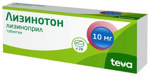 Показания к применению— артериальная гипертензия (в качестве монотерапии или в комбинации с другими антигипертензивными препаратами); — хроническая сердечная недостаточность (в составе комбинированной терапии для лечения больных, принимающих препараты наперстянки и/или диуретики); — ранний период острого инфаркта миокарда (в первые 24 ч) со стабильными показателями гемодинамики (для поддержания показателей гемодинамики и профилактики дисфункции левого желудочка и сердечной недостаточности).Применение при беременности и кормлении грудьюПрименение Лизинотона при беременности противопоказано. Лизиноприл проникает через плацентарный барьер.;При установлении беременности прием препарата следует прекратить как можно раньше. Прием ингибиторов АПФ во II и III триместрах беременности оказывает неблагоприятное воздействие на плод (возможны выраженное снижение АД, почечная недостаточность, гиперкалиемия, гипоплазия черепа, внутриутробная смерть). Данных о негативном влиянии препарата на плод в случае применения в I триместре нет. За новорожденными и грудными детьми, которые подверглись внутриутробному воздействию ингибиторов АПФ, рекомендуется установить тщательное наблюдение для своевременного выявления выраженного снижения АД, олигурии, гиперкалиемии.;Данных о проникновении лизиноприла в грудное молоко нет. При необходимости назначения препарата в период лактации грудное вскармливание следует прекратить.Противопоказания— ангионевротический отек в анамнезе (в т.ч. при применении ингибиторов АПФ); — наследственный отек Квинке; — возраст до 18 лет (эффективность и безопасность не установлены); — повышенная чувствительность к лизиноприлу или другим ингибиторам АПФ.;С осторожностью следует назначать препарат при выраженных нарушениях функции почек, двустороннем стенозе почечных артерий или стенозе артерии единственной почки с прогрессирующей азотемией, состоянии после трансплантации почки, почечной недостаточности, азотемии, гиперкалиемии, стенозе устья аорты, гипертрофической обструктивной кардиомиопатии, первичном гиперальдостеронизме, артериальной гипотензии, цереброваскулярных заболеваниях (в т.ч. недостаточности мозгового кровообращения), ИБС, коронарной недостаточности, аутоиммунных системных заболеваниях соединительной ткани (в т.ч. склеродермии, системной красной волчанке), угнетении костномозгового кроветворения, гиповолемических состояниях (в т.ч. в результате диареи, рвоты); пациентам, находящимся на диете с ограничением натрия, пациентам пожилого возраста.СоставЛизиноприла дигидрат 10.89 мг,;что соответствует содержанию лизиноприла 10 мг;Вспомогательные вещества: маннитол — 28 мг, кальция гидрофосфата дигидрат — 87.43 мг, крахмал кукурузный прежелатинизированный — 5.7 мг, натрия кроскармеллоза — 5.6 мг, магния стеарат — 980 мкг, пигментная смесь РВ-24823 розовая — 1.4 мг.