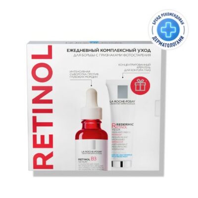 Набор LA ROCHE-POSAY RETINOL: В состав набора входят: 1.LA ROCHE-POSAY RETINOL В3 сыворотка, 30 мл: Интенсивная сыворотка против глубоких морщин, для выравнивания цвета лица и текстуры кожи. Признаки старения, вызванные солнечным (УФ) излучением, менее выражены: значительно сокращены глубокие и поверхностные морщины, микрорельеф кожи и цвет лица заметно выровнены. Мгновенно кожа выглядит более гладкой. День за днем кожа заметно более упругая и эластичная. Длительное увлажнение до 24 часов. Подходит даже для чувствительной кожи. 2.LA ROCHE-POSAY REDERMIC RETINOL Yeux Интенсивный концентрированный крем-гель для контура глаз, против морщин, мешков и темных кругов под глазами, 15 мл: Интенсивный концентрированный гель-крем для контура глаз Redermic Retinol от La Roche-Posay (Франция) обладает омолаживающим эффектом – корректирует признаки фотостарения и усталости кожи вокруг глаз, направлен против морщин, мешков и темных кругов под глазами. 3.LA ROCHE-POSAY ANTHELIOS Антивозрастной крем для лица SPF50, 15 мл: Предотвращает и корректирует признаки преждевременного старения кожи, вызванные ежедневным воздействием ультрафиолета.