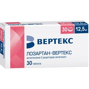 Показания к применениюАртериальная гипертензия.;Снижение риска ассоциированной сердечно-сосудистой заболеваемости и смертности у пациентов с артериальной гипертензией и гипертрофией левого желудочка, проявляющееся снижением совокупно частоты сердечно-сосудистой смертности, частоты инсульта и инфаркта миокарда.;Защита почек у пациентов с сахарным диабетом 2 типа с протеинурией — замедление прогрессирования почечной недостаточности, проявляющееся снижением частоты гиперкреатининемии, частоты развития терминальной стадии ХПН, требующей проведения гемодиализа или трансплантации почек, показателей смертности, а также снижение протеинурии.;Хроническая сердечная недостаточность (в составе комбинированной терапии, при непереносимости или неэффективности терапии ингибиторами АПФ).Применение при беременности и кормлении грудьюПротивопоказан к применению при беременности и в период лактации.ПротивопоказанияБеременность, лактация, детский и подростковый возраст до 18 лет, повышенная чувствительность к лозартану.Побочное действиеСо стороны сердечно-сосудистой системы: головокружение, ортостатическая гипотензия.;Со стороны обмена веществ: гиперкалиемия.;Аллергические реакции: ангионевротический отек (включая отеки лица, губ, глотки и/или языка), крапивница.;Со стороны пищеварительной системы: диарея, повышение активности АЛТ.;Со стороны ЦНС: головная боль.;Дерматологические реакции: зуд.;Прочие: нарушения функции почек, миалгии.СоставЛозартан калия 12.5 мг;Вспомогательные вещества: лактозы моногидрат — 58.6 мг, целлюлоза микрокристаллическая — 20 мг, кроскармеллоза натрия — 4 мг, повидон (поливинилпирролидон низкомолекулярный) — 3.2 мг, кремния диоксид коллоидный — 0.7 мг, магния стеарат — 1 мг.;Состав пленочной оболочки: (гипромеллоза — 1.8 мг, тальк — 0.6 мг, титана диоксид — 0.33 мг, макрогол 4000 (полиэтиленгликоль 4000) — 0.27 мг) или (сухая смесь для пленочного покрытия, содержащая гипромеллозу 60%, тальк 20%, титана диоксид 11%, макрогол 4000 (полиэтиленгликоль 4000) 9%) — 3 мг.Взаимодействие с другими препаратамиПри одновременном применении с диуретиками в высоких дозах возможна артериальная гипотензия.;При одновременном применении с препаратами калия, калийсберегающими диуретиками повышается риск развития гиперкалиемии.;При одновременном применении с индометацином возможно уменьшение эффективности лозартана.;Имеется сообщение о развитии интоксикации литием при одновременном применении с лития карбонатом.;При одновременном применении с орлистатом уменьшается антигипертензивное действие лозартана, что может привести к значительному повышению АД, развитию гипертонического криза.;При одновременном применении с рифампицином повышается клиренс лозартана и уменьшается его эффективность.