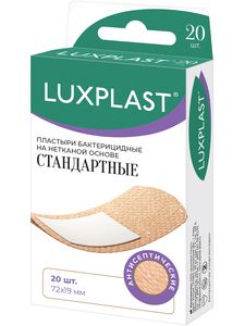 Luxplast стандартные бактерицидные на нетканой основе.Пластыри медицинские бактерицидные предназначены для закрытия поверхностных ран, порезов, ссадин, ингибирования роста микроорганизмов, профилактики травматизации и внешнего инфицирования поверхностных травм кожи, оказывают антисептическое действие.Свойства:Воздухопроницаемые, антисептическиеАнтисептик: хлоргексидин.Материал: НетканыйЦвет: ТелесныйРазмеры: 72 мм x 19 мм