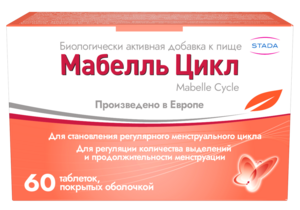 МАБЕЛЛЬ ЦИКЛ (Mabelle Cycle) — Биологически активная добавка (БАД) к пище — поможет поддержать становление менструального цикла и нормализовать объем кровопотери и продолжительность менструации. Компоненты негормонального комплекса Мабелль Цикл на протяжении длительного времени применялись, как в народной, так и в научной медицине для регуляции и поддержки менструального цикла женщины.Содержание в суточной норме потребления (2 таблетки, покрытые оболочкой):Железо 40 мг 286*% от рекомендуемого уровня суточного потребления или от адекватного1 уровня потребленияИзофлавоны 100 мг 200 1*% от рекомендуемого уровня суточного потребления или от адекватного1 уровня потребленияФенилаланин 600 мг 14 1% от рекомендуемого уровня суточного потребления или от адекватного1 уровня потребления5-гидрокситриптофан 80 мг -* не превышает верхний допустимый уровень потребленияНормальный менструальный цикл — важный показатель репродуктивного здоровья женщины.Регулируется менструальный цикл половыми гормонами, уровень которых меняется в зависимости от фазы этого цикла.В течение жизни любая женщина неизбежно сталкивается с физиологическими (становление цикла у подростков, изменения цикла в предклимактерический период, восстановление цикла после родов) и патологическими (нерегулярный цикл, отсутствие менструаций, обильные менструации и др.) изменениями менструального цикла.Наиболее «проблемным» периодом менструального цикла является предменструальный период, течение которого может сопровождаться болезненными ощущениями внизу живота, набуханием и болезненностью молочных желез, эмоциональной нестабильностью, раздражительностью, повышением аппетита, отеками, головной болью, тошнотой и другими симптомами.Регуляция любых изменений менструального цикла включает в себя поддержку баланса гормонов и поддержку психо-эмоционального состояния, обменных процессов, восполнение уровня необходимых для протекания нормального менструального цикла пищевых нутриентов и микроэлементов.АКТИВНЫЕ ИНГРЕДИЕНТЫ:Гриффония простолистная — африканское лекарственное растение, является источником 5-гидрокситриптофана (5-НТР). 5-НТР — является предшественником серотонина — особого вещества в организме, отвечающего за регуляцию настроения. Серотонин оказывает важнейшее влияние на эмоциональное состояние человека. Дефицит серотонина нередко наблюдается в предменструальный период и может привести к развитию депрессивных состояний, бессонницы, беспокойства, к постоянной головной боли. Исследования показали, что 5-НТР, содержащийся в экстракте гриффонии простолистной, является достаточно эффективным природным антидепрессантом и способствует нормализации психо-эмоционального состояния в предменструальный период, в частности, снижает чувство подавленности, напряженности, беспокойства, эмоциональную неустойчивость и раздражительность.Экстракт витекса священного — помогает нормализовать естественную выработку гормонов, обеспечивающих регуляцию менструального цикла. Экстракт витекса священного способен снижать уровень гормона пролактина (повышенная концентрация пролактина — одна из причин сбоев менструального цикла, изменения характера месячных, болезненных ощущений в молочных железах). К тому же пролактин называют «гормоном стресса», так как 