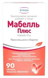 Биологически активная добавка к пище — источник изофлавонов, флаволигнанов и ресвератрола, дополнительный источник витаминов: B6, D3 (200 МЕ в таблетке), E, фолиевой кислоты и микроэлементов: бора и кальция, содержащей аланин и 5-гидрокситриптофан.Комплекс Мабелль Плюс — это негормональное растительное средство, разработанное специально для женщин с учетом их специфических потребностей во время гормональных изменений — менопаузального перехода. Каждая женщина проходит в своей жизни биологический этап, который связан с различными неприятными проявлениями, вызванными снижением уровня женских половых гормонов — эстрогенов.Мабелль Плюс может служить дополнительным источником изофлавонов и флаволигнанов, а также способствовать повышению антиоксидантной защиты организма, поддержанию углеводного, липидного обменов и гормонального баланса женщин. Карбонат кальция (кальций), бета-аланин, экстракт семян льна посевного (Linum usitatissimum L.), экстракт клевера лугового (Trifolium pratense) (содержание изофлавнов 90%), экстракт семян гриффонии простолистной (Griffonia simplicifolia) (содержание 5-гидрокситриптофана 98%), экстракт соевых бобов (Glycine max), ресвератрол (из экстракта горца японского), D-альфа-токоферол (витамин E), борная кислота (бор), холекальциферол (витамин D3), пиридоксина гидрохлорид (витамин В6), фолиевая кислота, целлюлоза (Е460)- антислеживающий агент, фосфаты кальция (Е341)-носитель, карбоксиметилцеллюлоза (Е468)-стабилизатор, диоксид кремния (Е551)-антислеживающий агент, магниевая соль стеариновой кислоты (Е470b)- антислеживающий агент, Оболочка: гидроксипропилметилцеллюлоза (Е464), гидроксипропилцеллюлоза (Е463), кармин (Е120), тальк (Е553b), сафлоровый концентрат, лимонный пигмент, полиэтиленгликоль (Е1521), стеариновая кислота (Е570).