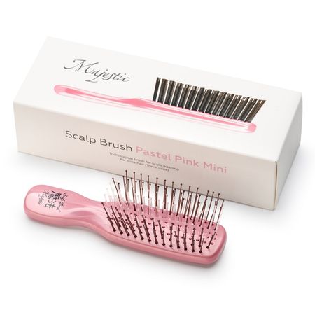 Majestic Mini Pastel Pink имеет 198 зубчиков с литыми наконечниками, предназначена для ослабленных волос: она очищает более 150 тысяч пор от скопившихся загрязнений и обеспечивает эффект легкого пилинга – старые клетки устраняются, и кожа буквально начинает дышать. Массаж усиливает приток крови к корням волос – это благоприятно воздействует на волосяные фолликулы, в том числе спящие – к ним поступает больше микро- и макроэлементов. Волосы начинают расти быстрее, а при регулярном применении становятся гуще, сильнее, наполняются естественным блеском. Эргономичная ручка обеспечивает легкий захват и максимальное удобство при использовании. Подходит для использования в салонах красоты стилистами и для домашнего использования. Все расчёски Majestic scalp brush укомплектованы антистатической резинкой из акрилового волокна, пропитанного ионами меди
