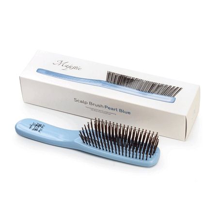 Трихологическа расческа Majestic Pearl Blue для густых жестких волос. 568 зубчиков с литыми наконечниками тщательно очищают более сорока тысяч пор от скопившихся загрязнений, а эффект легкого пилинга обеспечивает устранение старых клеток — кожа начинает дышать. Массаж усиливает приток крови к корням волос — это благоприятно воздействует на волосяные фолликулы, в том числе спящие — к ним поступает больше микро- и макроэлементов. Волосы начинают расти быстрее, а при регулярном применении становятся гуще, сильнее, наполняются естественным блеском.