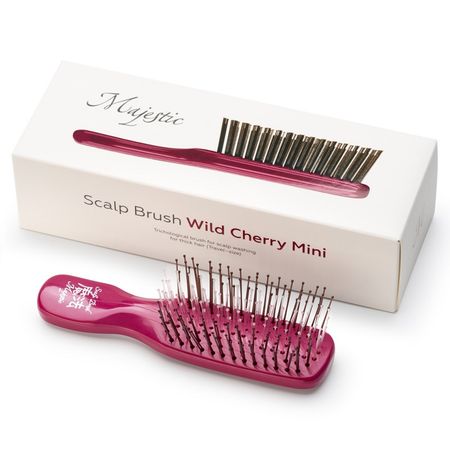 Majestic Mini Wild Cherry имеет 198 зубчиков с литыми наконечниками, предназначена для ослабленных волос: она очищает более 150 тысяч пор от скопившихся загрязнений и обеспечивает эффект легкого пилинга – старые клетки устраняются, и кожа буквально начинает дышать. Массаж усиливает приток крови к корням волос – это благоприятно воздействует на волосяные фолликулы, в том числе спящие – к ним поступает больше микро- и макроэлементов. Волосы начинают расти быстрее, а при регулярном применении становятся гуще, сильнее, наполняются естественным блеском. Эргономичная ручка обеспечивает легкий захват и максимальное удобство при использовании. Подходит для использования в салонах красоты стилистами и для домашнего использования. Все расчёски Majestic scalp brush укомплектованы антистатической резинкой из акрилового волокна, пропитанного ионами меди
