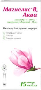 Прозрачная жидкость светло-коричневого цвета с запахом карамели.Характеристика препарата:Препарат Магнелис® В6 Аква представляет собой лекарственное средство в форме раствора для приема внутрь и является комбинацией витамина B6 с минеральными веществами. Препарат содержит действующие вещества: магния лактата дигидрат, магния пидолат, пиридоксина гидрохлорид (Витамин B6).Магний является жизненно важным элементом, который находится во всех тканях организма и необходим для нормального функционирования клеток, а также участвует в большинстве реакций обмена веществ. Магний участвует в регуляции передачи нервных импульсов и в сокращении мышц. Недостаток магния в организме может наблюдаться при нарушении режима питания (диета) или при дисбалансе поступления магния в организм (в том числе опосредованном снижении уровня магния в продуктах питания). Также недостаток магния может быть связан с увеличением потребности в магнии, особенностями метаболизма и ускоренном выведении магния (например, при повышенной физической и умственной нагрузке, стрессе, в период беременности, при применении мочегонных средств — диуретиков).Пиридоксин (витамин B6) участвует во многих метаболических процессах, в регуляции работы нервной системы. Витамин B6 улучшает всасывание магния из желудочно-кишечного тракта и его проникновение в клетки.Магний и пиридоксин усиливают действие друг друга.