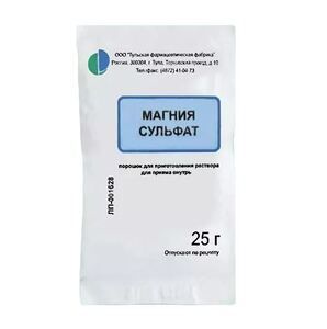 Показания к применениюГипертонический криз; поздний токсикоз беременных; судорожный синдром.;Купирование эпилептического статуса (в составе комплексной терапии).Применение при беременности и кормлении грудьюПри беременности магния сульфат применяют с осторожностью, только в случаях, когда ожидаемый терапевтический эффект превышает потенциальный риск для плода.;При необходимости применения в период лактации грудное вскармливание следует прекратить.ПротивопоказанияПовышенная чувствительность к препарату; AV блокада; артериальная гипотензия; состояния, сопровождающиеся дефицитом кальция, угнетением дыхательного центра.Побочное действиеРанние признаки и симптомы гипермагниемии: брадикардия, диплопия, внезапный прилив крови к лицу, головная боль, снижение АД, тошнота, одышка, смазанная речь, рвота, слабость.;Признаки гипермагниемии (в порядке повышения концентрации магния в сыворотке крови): снижение глубоких сухожильных рефлексов (2-3.5 ммоль/л), удлинение интервала PQ и расширение комплекса QRS на ЭКГ (2.5-5 ммоль/л), утрата глубоких сухожильных рефлексов (4-5 ммоль/л), угнетение дыхательного центра (5-6.5 ммоль/л), нарушение проводимости сердца (7.5 ммоль/л), остановка сердца (12.5 ммоль/л); кроме того — гипергидроз, тревога, выраженный седативный эффект, полиурия, атония матки.;При приеме внутрь: тошнота, рвота, диарея, обострение воспалительных заболеваний ЖКТ, нарушение электролитного баланса (повышенная утомляемость, астения, спутанное сознание, аритмия, судороги), метеоризм, абдоминальная боль спастического характера, жажда, признаки гипермагниемии при наличии почечной недостаточности (головокружение).СоставМагния сульфат — 250 мг