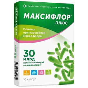 Нормальная микрофлора желудочно-кишечного тракта (ЖКТ) очень важна для здоровья человека, она обеспечивает слаженную работу всего организма. Поддерживать ее биохимическое, метаболическое и иммунологическое равновесие помогают различные виды микроорганизмов, существующих в тесной взаимосвязи друг с другом. Но иногда бактериальный баланс нарушается, вследствие чего у человека понижается уровень иммунитета и могут возникнуть различные заболевания внутренних органов. Дисбалансу кишечной микрофлоры часто подвержены дети1,а также взрослые, независимо от пола и рода деятельности.Причины нарушения микрофлоры кишечника Прием антибиотиков2. Активные вещества этой группы лекарственных препаратов позволяют уничтожать патогенные бактерии, но вместе с ними под прицел попадаюти другие микроорганизмы, мирно обитающие в кишечнике здорового человека. Нерациональное питание3. При систематическом нарушении определенных ограничений по калорийности и распределению количества белков, жиров и углеводов организму тяжело справиться с процессом переваривания из-за брожения или гниения, вследствие этого развивается дисбаланс микрофлоры. Качество и количество употребляемой пищи. Большое количество синтетических добавок, красителей, стабилизаторов и ароматизаторов является непомерной нагрузкой на кишечный тракт. Оптимальным является такой объем порции, который помещается в ладонь человека. Питаться следует часто, через каждые три-четыре часа, а за три часа до сна следует употреблять лишь легкую пищу. Значение имеети то, как человек ест. Большие перерывы между приемами пищи, еда быстро и всухомятку, отсутствие полноценного обеда – это все не может не сказаться на течении процессов пищеварения в желудке и способствует повышению агрессивных свойств желудочного сока и ослаблению защитного барьера слизистой оболочки. Кишечные инфекции. Возбудители этих болезней, последующая терапия антибиотиками, а также работа собственной иммунной системы человека вызывают угнетение нормальной кишечной микрофлоры. Хронические заболевания пищеварительного тракта. При функциональных расстройствах частично переваренная пища, поступающая в кишечник, не будет подготовлена должным образом. Тяжелые системные заболевания. Возможны любые функциональные нарушения работы системы пищеварения, в том числе и дисбаланс микрофлоры. Ограничения в питании4. Увлечение диетами и методиками очищения зачастую отрицательно влияет на здоровье человека. Организм склонен встречать строгую диету как стресс, недополучая необходимые ему питательные вещества, минералыи витамины. Все это губительно сказывается на функционировании ЖКТ и организма в целом.МАКСИФЛОР ПЛЮС – ЭТО 30 МИЛЛИАРДОВ ЖИВЫХ5ПРОБИОТИЧЕСКИХ БАКТЕРИЙ В 1 КАПСУЛЕ ДЛЯ ДЕТЕЙ И ВЗРОСЛЫХПробиотики – это полезные микроорганизмы, которые нормализуют состав и биологическую активность микрофлоры кишечного тракта.Большинство пробиотиков-бактерий относятся к двум родам: лактобактерии(лат. Lactobacillus) и бифидобактерии (лат. Bifidobacterium)6.Бифидобактерии составляют основу микрофлоры желудочно-кишечного тракта человека. Они обеспечивают процессы обмена белков и жиров и участвуют в регуляции минерального обмена, синтезе аминокислот, витаминов К и группы В.Кроме своих основных функций, эти микроорганизмы: пр