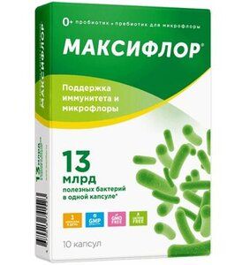 Нормальная микрофлора желудочно-кишечного тракта (ЖКТ) очень важна для здоровья человека, она обеспечивает слаженную работу всего организма. Поддерживать ее биохимическое, метаболическое и иммунологическое равновесие помогают различные виды микроорганизмов, существующих в тесной взаимосвязи друг с другом. Но иногда бактериальный баланс нарушается, вследствие чего у человека понижается уровень иммунитета и могут возникнуть различные заболевания внутренних органов. Дисбалансу кишечной микрофлоры часто подвержены дети1,а также взрослые, независимо от пола и рода деятельности.Причины нарушения микрофлоры кишечника Прием антибиотиков2. Активные вещества этой группы лекарственных препаратов позволяют уничтожать патогенные бактерии, но вместе с ними под прицел попадаюти другие микроорганизмы, мирно обитающие в кишечнике здорового человека. Нерациональное питание3. При систематическом нарушении определенных ограничений по калорийности и распределению количества белков, жиров и углеводов организму тяжело справиться с процессом переваривания из-за брожения или гниения, вследствие этого развивается дисбаланс микрофлоры. Качество и количество употребляемой пищи. Большое количество синтетических добавок, красителей, стабилизаторов и ароматизаторов является непомерной нагрузкой на кишечный тракт. Оптимальным является такой объем порции, который помещается в ладонь человека. Питаться следует часто, через каждые три-четыре часа, а за три часа до сна следует употреблять лишь легкую пищу. Значение имеети то, как человек ест. Большие перерывы между приемами пищи, еда быстро и всухомятку, отсутствие полноценного обеда – это все не может не сказаться на течении процессов пищеварения в желудке и способствует повышению агрессивных свойств желудочного сока и ослаблению защитного барьера слизистой оболочки. Кишечные инфекции. Возбудители этих болезней, последующая терапия антибиотиками, а также работа собственной иммунной системы человека вызывают угнетение нормальной кишечной микрофлоры. Хронические заболевания пищеварительного тракта. При функциональных расстройствах частично переваренная пища, поступающая в кишечник, не будет подготовлена должным образом. Тяжелые системные заболевания. Возможны любые функциональные нарушения работы системы пищеварения, в том числе и дисбаланс микрофлоры. Ограничения в питании4. Увлечение диетами и методиками очищения зачастую отрицательно влияет на здоровье человека. Организм склонен встречать строгую диету как стресс, недополучая необходимые ему питательные вещества, минералыи витамины. Все это губительно сказывается на функционировании ЖКТ и организма в целом.МАКСИФЛОР ПЛЮС – ЭТО 30 МИЛЛИАРДОВ ЖИВЫХ5ПРОБИОТИЧЕСКИХ БАКТЕРИЙ В 1 КАПСУЛЕ ДЛЯ ДЕТЕЙ И ВЗРОСЛЫХПробиотики – это полезные микроорганизмы, которые нормализуют состав и биологическую активность микрофлоры кишечного тракта.Большинство пробиотиков-бактерий относятся к двум родам: лактобактерии(лат. Lactobacillus) и бифидобактерии (лат. Bifidobacterium)6.Бифидобактерии составляют основу микрофлоры желудочно-кишечного тракта человека. Они обеспечивают процессы обмена белков и жиров и участвуют в регуляции минерального обмена, синтезе аминокислот, витаминов К и группы В.Кроме своих основных функций, эти микроорганизмы: пр