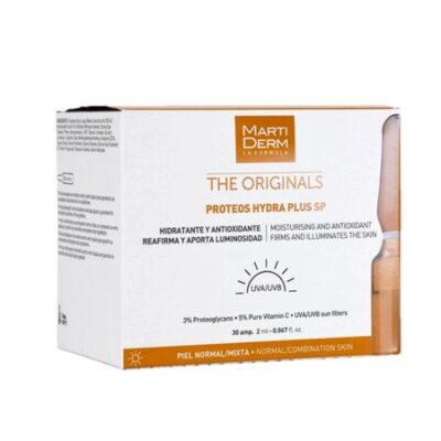 MartiDerm The Originals Proteos Hydra Plus SP — это легкая сыворотка в индивидуальных ампулах, которая мгновенно увлажняет кожу и делает ее ярче с течением времени. С чистым витамином С и протеогликанами, а также защитой от солнца. MartiDerm The Originals Proteos Hydra Plus SP осветляет и глубоко увлажняет кожу с момента ее нанесения. С протеогликанами для увлажнения кожи и чистым витамином С, чтобы получить антиоксидантный эффект и анти UVA/UVB радиационной защитой, чтобы полностью защитить кожу. Жидкая текстура очень легко впитывается и делает оставляет кожу гладкой, но без каких-либо жирных ощущений.