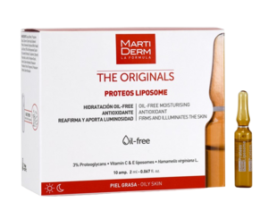 Внешний вид и свойства: лёгкая сыворотка прозрачно-желтоватого цвета, с легкой отдушкой.Сыворотка-уход для увлажнения и восстановления кожи.Обладает антиоксидантными свойствами, восстанавливает сияние.Не содержит масел.Обеспечивает профилактику появления морщин.Особая формула MartiDerm The Originals Proteos Liposome Ampoules, не содержащая масел, превосходно ухаживает за кожей, оставляя ее нежной и шелковистой.Средство насыщает дерму влагой, предупреждает ее обезвоживание, придает упругость и эластичность.Активные компоненты проявляют вяжущее и тонизирующее действие, способствуют сужению пор, осветляют эпидермис и выравнивают его тон.Активные ингредиенты: Протеогликаны 3% удерживает влагу в клетках эпидермиса; Липосомы витаминов С и Е обладают антиоксидантными свойствами, продляют молодость кожи; Гамамелис виргинский сужает поры, улучшает микроциркуляцию, повышает тонус дермы.При регулярном применении Ампулы Протеос с Липосомами МартиДерм Ориджиналс замедляют старение кожи и предупреждают появление морщин.Результат:Увлажненная, тонизированная, гладкая и сияющая кожа.Научно доказано увлажнение дермы на 82% после однократного нанесения.