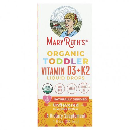 MaryRuth Organics, Органические жидкие капли с витаминами D3 и K2 для малышей, для детей от 1 до 3 лет, без добавок, 30 мл (1 жидк. Унция)