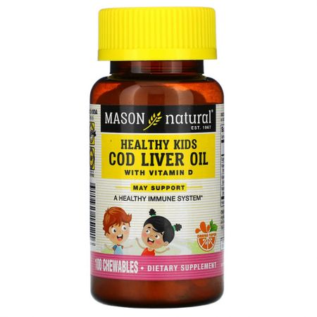 Mason Natural, Healthy Kids, жир печени трески с витамином D, апельсин, 100 жевательных таблеток