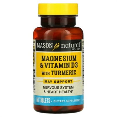 Пищевая ценностьРазмер порции: 1 таблетка Количество в 1 порции% от суточной нормыКальций (в виде дикальций фосфата)64 мг 5%Витамин D3 (холекальциферол)75 мкг (3000 МЕ)370%Магний (в виде оксида магния)500 мг120%Экстракт из корня куркумы (Curcuma longa), стандартизированный до 95% куркуминоидов150 мг**** Суточная норма не определена. Компания основана в 1967 годуМожет поддерживатьЗдоровье нервной системы и сердцаПищевая добавкаНе содержит соиПродукт прошел лабораторные испытания и имеет гарантию качества MasonПроизводится в соответствии со стандартом качества cGMP. Сертификат качества 5 Star