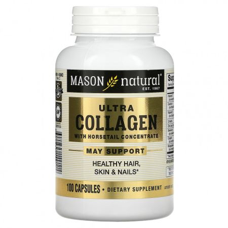 (Polygonum multiflorum) (корень) концентрат 12:1, 8,334 мг (эквивалент 100 мг)100 мг**L-метионин25 мг**N-ацетил L-цистеин25 мг**Кремний (в виде диоксида кремния)12 мг**** Суточная норма не определена. На рынке с 1967 годаМожно использовать для поддержания здоровья волос, кожи и ногтейПищевая добавкаНе содержит глютенаНе содержит соиПродукт прошел лабораторные испытания и имеет гарантию качества MasonПроизводится в соответствии со стандартами текущей надлежащей производственной практики (cGMP)Коллаген — это тип белка, составляющий около 25% от общего количества белков в организме. Его называют клеем, который скрепляет тело. Без него тело бы буквально распалось. Он также поддерживает целостность других тканей тела — кожи, костей, сухожилий, мышц и хрящей. Однако с возрастом происходит деградация коллагена, приводящая к появлению морщин. Таким образом, коллаген — важное вещество для тех, кто ищет способы борьбы с проявлениями старения.