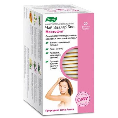 Чай Эвалар БИО Мастофит — 100% натуральный состав.Для здоровья женской груди2 фильтр-пакета в день обеспечивают не менее1 14 мг флавоноидов в перерасчете на рутин, что составляет 46% от адекватного уровня потребления.Витекс священный применяют при гинекологических заболеваниях. Активные действующие вещества витекса священного способствуют снижению выработки пролактина, что приводит в равновесие общий гормональный фон организма.Душица обыкновенная широко используется как средство для регулирования менструаций при их задержке, при болезненных менструациях, как успокаивающее средство.Ромашка аптечная оказывает спазмолитическое, противовоспалительное, антисептическое, седативное и некоторое обезболивающее действие. Отмечено положительное действие ромашки при болезненных менструациях. А ромашка и тысячелистник — при маточных кровотечениях.Календула лекарственная снимает артериальное давление, вызывает гибель многих болезнетворных микроорганизмов. Большое содержание витамина С, эфирных масел, дубильных веществ и каротиноидов делает календулу эффективным средством лечения. Она обладает антисептическими, ранозаживляющими, иммуностимулирующими и противовоспалительными свойствами. Применение календулы при мастопатии улучшает регенерацию тканей груди и улучшает иммунитет.Пион белоцветковый используют как болеутоляющее, противосудорожное, противовоспалительное, для лечения гинекологических заболеваний.Тысячелистник обыкновенный употребляется при женских болезнях для остановки кровотечения и жалобах, связанных с менструальным циклом, особенно при спастических менструациях и климактерических расстройствах.