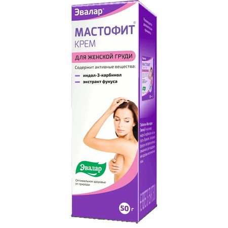 Мастофит крем — косметическое средство , содержащее экстракт фукуса, индол-3-карбинол.Сочетание индол-3-карбинола и экстракта фукуса способствует сохранению здоровья женской груди снаружи.Описание активных компонентов:Индол-3-карбинол — вещество, полученное из овощей семейства крестоцветных. Способствует уменьшению риска развития эстрогензависимых новообразований. Кроме того, это вещество способствует уменьшению влияния агрессивных метаболитов эстрогена (эстрадиола) на молочные железы.Экстракт фукуса (бурых водорослей) используется как богатый источник йода, а также имеет противорадионуклидные свойства.Средство не содержит в составе гормонов, поэтому не нарушает естественный гормональный фон в организме.Косметическое средство применяют наружно, нанося небольшое количество крема на кожу груди, втирая его легкими массажными движениями. Не нужно смывать. Частота применения — 1 или 2 раза в день. Совместно с кремом можно использовать другой продукт компании «Эвалар» — таблетки «Мастофит», также содержащие индол-3-кабринол с экстрактом фукуса и доставляющие растительные индолы к молочным железам изнутри.Рекомендуется для сохранения здоровья женской груди. Способствует нормализации обменных процессов, питанию и увлажнению кожи, улучшению формы груди.
