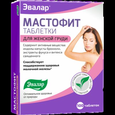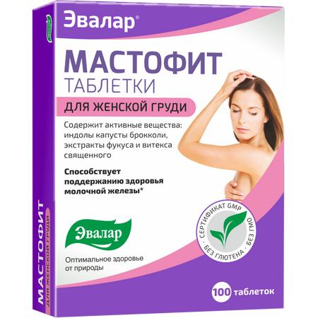 Мастофит таблетки — комплексная биологически активная добавка к пище, фитопродукт для поддержания здоровья молочной железы.Мастофит является комплексным продуктом, в состав которого входит концентрат капусты брокколи, богатый индол-3-карбинолом (до 50 мг/%), а также аскорбигеном (до 1,5%), сульфорафаном (до 6 мг/%).Кроме того, в состав таблеток Мастофит введен экстракт витекса священного (прутняка), который во всем мире входит в натуральные составы для поддержания здоровья молочной железы. Активные действующие вещества витекса священного способствуют снижению выработки пролактина, что приводит в равновесие общий гормональный фон организма.Таким образом, Мастофит Эвалар является комплексным фитопродуктом для поддержания здоровья молочной железы, воздействующим на многие известные факторы возникновения изменений в молочных железах.Таблетки Мастофит Эвалар и крем Мастофит, действуя совместно и усиливая друг друга, доставят растительные индолы непосредственно к месту назначения.Действие компонентов, входящих в состав МастофитИндол-3-карбинол — основное биологически активное вещество, содержащееся в овощах семейства крестоцветных. Самой важной функцией индол-3-карбинола (помимо антиоксидантных свойств) является сохранение здоровья тканей молочной железы.Экстракт фукуса — источник органического йода, который оказывает рассасывающий эффект и не дает осложнений, наблюдающихся при применении металлического йода.Экстракт витекса священного (прутняка) — источник иридоидов и эфирных масел, содержащих дитерпены, угнетающие образование пролактина. Снижение содержание пролактина до физиологически нормального уровня сохраняет здоровье тканей молочных желез.