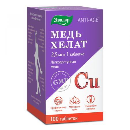 Самая легко усваиваемая форма меди* Медь хелат Эвалар способствует: снижению риска преждевременного появления седины, сохранению цвета волос выработке коллагена и эластина, поддержанию тонуса и молодости кожи нормализации уровня гемоглобина, укреплению стенок кровеносных сосудов улучшению здоровья мозга и глаз укреплению иммунитета, костей суставов. * В ассортименте Эвалар.