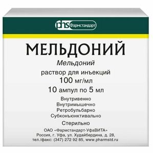 Главная » Аптека Мельдоний Фармстандарт Раствор для инъекций 100 мг/мл 5 мл 10 шт Просмотров 7 Прозрачная бесцветная жидкость. Фармстандарт