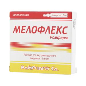 Показания к применениюПредназначен для симптоматической терапии, уменьшения боли и воспаления на момент использования, на прогрессирование заболевания не влияетПрименение при беременности и кормлении грудьюПодавление синтеза простагландинов может оказывать нежелательное воздействие на беременность и развитие плода. Таким образом, Мелофлекс Ромфарм противопоказан во время беременности.Мелоксикам выделяется с грудным молоком, поэтому Мелофлекс Ромфарм противопоказан в период лактации. На время приема препарата необходимо прекратить грудное вскармливаниеПротивопоказанияГиперчувствительность (в т.ч. к другим НПВС), «аспириновая» триада (сочетание бронхиальной астмы, рецидивирующего полипоза носа и околоносовых пазух и непереносимости ацетилсалициловой кислоты и ЛС пиразолонового ряда), язвенная болезнь желудка и двенадцатиперстной кишки в стадии обострения, желудочно-кишечное, цереброваскулярное или иное кровотечение/кровоизлияние, тяжелая сердечная недостаточность, тяжелая печеночная недостаточность, тяжелая почечная недостаточность (если не проводится гемодиализ), беременность, кормление грудью, возраст до 15 лет.Побочное действиеЧастота развития побочных эффектов: часто (более 1%), нечасто (0.1-1%), редко (0.01-0.1%), очень редко (менее 0.01%).Со стороны пищеварительной системы: часто — диспепсия, в т.ч. тошнота, рвота, абдоминальные боли, запор, метеоризм, диарея; нечасто — преходящее повышение активности печеночных трансаминаз, гипербилирубинемия, отрыжка, эзофагит, гастродуоденальная язва, кровотечение из ЖКТ (в т.ч. скрытое), стоматит; редко — перфорация ЖКТ, колит, гепатит, гастрит.Со стороны органов кроветворения: часто — анемия; нечасто — изменение формулы крови, в т.ч. лейкопения, тромбоцитопения.Со стороны кожных покровов: часто — зуд, кожная сыпь; нечасто — крапивница; редко — фотосенсибилизация, буллезные высыпания, многоформная эритема, в т.ч. синдром Стивенса-Джонсона, токсический эпидермальный некролиз.Со стороны дыхательной системы: нечасто — возникновение приступов бронхиальной астмы у лиц с аллергией на ацетилсалициловую кислоту или другие НПВС.Со стороны ЦНС: часто — головокружение, головная боль; нечасто — вертиго, шум в ушах, сонливость; редко — спутанность сознания, дезориентация, эмоциональная лабильность.Со стороны сердечно-сосудистой системы: часто — периферические отеки; нечасто — повышение АД, ощущение сердцебиения, приливы крови к коже лица.Со стороны мочевыделительной системы: нечасто — гиперкреатининемия и/или повышение концентрации мочевины в сыворотке крови; редко — острая почечная недостаточность; связь с приемом мелоксикама не установлена — интерстициальный нефрит, альбуминурия, гематурия.Со стороны органов чувств: редко — конъюнктивит, нарушение зрения, в т.ч. нечеткость зрительного восприятия.Аллергические реакции: редко — ангионевротический отек, анафилактоидные/анафилактические реакции.