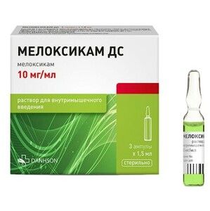 Показания к применению Симптоматическое лечение остеоартроза; Симптоматическое лечение ревматоидного артрита; Симптоматическое лечение анкилозирующего спондилита (болезнь Бехтерева).Применение при беременности и кормлении грудьюПрименение при беременности и лактации противопоказано.Противопоказания Гиперчувствительность к активному веществу или вспомогательным компонентам; противопоказан в период после проведения аортокоронарного шунтирования; декомпенсированная сердечная недостаточность; полное или неполное сочетание бронхиальной астмы рецидивирующего полипоза слизистой оболочки носа и околоносовых пазух и непереносимости ацетилсалициловой кислоты и других нестероидных противовоспалительных препаратов (в т.ч. в анамнезе); эрозивно-язвенные изменения слизистой оболочки желудка и 12-перстной кишки активное желудочно-кишечное кровотечение; обострение воспалительных заболеваний кишечника (неспецифический язвенный колит болезнь Крона); цереброваскулярное кровотечение или иные кровотечения; выраженная печеночная недостаточность или активное заболевание печени; выраженная почечная недостаточность у больных не подвергающихся диализу (клиренс креатинина менее 30 мл/мин) прогрессирующие заболевания почек в т.ч. подтвержденная гиперкалиемия; беременность период грудного вскармливания; детский возраст до 18 лет.Состав1 ампула содержит:Активный компонент:мелоксикам — 15 мг;Вспомогательные компоненты: этанол, полоксамер 188, натрия хлорид, глицин, меглюмин, натрия гидроксид, вода для инъекций.