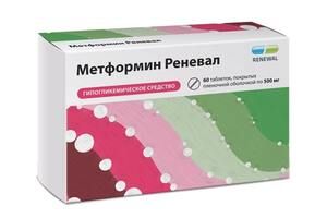 Метформин Реневал, 500 мг, таблетки, покрытые пленочной оболочкой Круглые двояковыпуклые таблетки, покрытые пленочной оболочкой белого или почти белого цвета. На поперечном разрезе ядро белого или почти белого цвета. Допускается шероховатость поверхности.Характеристика препарата:Действующим веществом препарата Метформин Реневал является метформин — средство для лечения сахарного диабета. Он относится к группе лекарственных средств, называемых бигуанидами