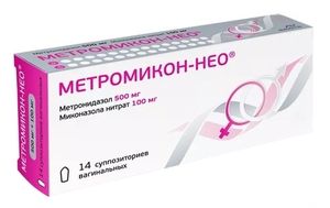 Показания к применениюВлагалищные инфекции: — вагинальный кандидоз . — трихомонадный вагинит и вульвовагинит, бактериальный вагиноз . — смешанная вагинальная инфекция.Применение при беременности и кормлении грудьюНазначение препарата противопоказано в I триместре беременности. Применение во II и III триместрах беременности возможно только в том случае, если потенциальная польза для матери превышает возможный риск для плода. При необходимости назначения препарата в период лактации грудное вскармливание должно быть прекращено, так как метронидазол проникает в грудное молоко. Грудное вскармливание можно возобновить через 24-48 ч после окончания лечения.Противопоказания— гиперчувствительность к компонентам препарата или другим производным нитроимидазола — I триместр беременности, период лактации, — детский возраст до 18 лет — у девственниц. С осторожностью: при печеночной и почечной недостаточности, порфирии, нарушении кроветворения и заболеваниях периферической и центральной нервной системы, сахарный диабет, нарушения микроциркуляции, при беременности (II и III триместры).Побочное действиеМестные реакции: жжение, зуд, раздражение слизистой оболочки влагалища и усиление отечности. Из-за воспаления слизистой оболочки влагалища при вагините раздражение может усиливаться после введения первого суппозитория или к третьему дню лечения. Эти осложнения быстро исчезают после прекращения лечения. Со стороны желудочно-кишечного тракта: боль или спазмы в животе, «металлический» привкус, сухость во рту, запор, диарея, потеря аппетита, тошнота, рвота. Со стороны нервной системы: головная боль, двигательные нарушения (атаксия), головокружение, психоэмоциональные нарушения, судороги. Со стороны системы кроветворения: лейкопения. Аллергические реакции: кожные высыпания, в том числе крапивница.Состав1 супп. метронидазол 500 мг миконазол 100 мг.