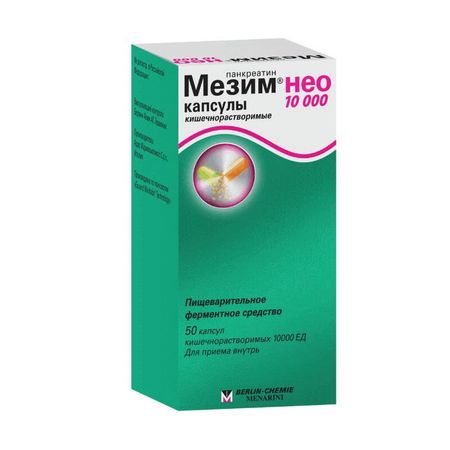 Капсулы кишечнорастворимые твердые желатиновые № 2, непрозрачные, цилиндрической формы с полусферическими концами: корпус капсулы светло-оранжевого цвета, крышечка капсулы желтовато-зеленого цвета; содержимое капсул: мини-таблетки цилиндрической формы, покрытые кишечнорастворимой оболочкой светло-бежевого цвета и с блестящей поверхностью; допускается наличие вкраплений. Фармакологическое действие Действующим веществом препарата Мезим® нео 10000 является панкреатин, представляющий собой порошок из поджелудочных желез свиней. Ферменты, входящие в состав панкреатина, способствуют расщеплению жиров, углеводов и белков, поступающих с пищей. Панкреатин, оказывая протеолитическое, амилолитическое и липолитическое действие, компенсирует ферментативную недостаточность поджелудочной железы, улучшает функциональное состояние ЖКТ, нормализует процессы пищеварения. Показания препарата Мезим® нео 10000 Заместительная терапия недостаточности экзокринной функции поджелудочной железы у взрослых и детей при следующих состояниях: хронический панкреатит; муковисцидоз; рак поджелудочной железы; состояния после оперативных вмешательств на поджелудочной железе и желудке (полная или частичная резекция органа); после облучения органов ЖКТ, сопровождающиеся нарушением переваривания пищи, метеоризмом, диареей (в составе комбинированной терапии); сужение протока поджелудочной железы (например, из-за опухоли или желчных камней); синдром Швахмана-Даймонда; подострый панкреатит; другие заболевания, сопровождающиеся экзокринной недостаточностью поджелудочной железы. Относительная ферментная недостаточность при следующих состояниях и ситуациях: расстройства ЖКТ функционального характера; при острых кишечных инфекциях, при синдроме раздраженного кишечника; употребление трудноперевариваемой растительной или жирной пищи. Подготовка к рентгенологическому и ультразвуковому исследованиям органов брюшной полости.