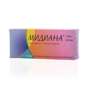 Показания к применениюКонтрацепция.Применение при беременности и кормлении грудьюПри беременности и в период лактации применение препарата Мидиана противопоказано. Если беременность наступила на фоне гормональной контрацепции, необходима немедленная отмена препарата. Имеющиеся немногочисленные данные о непреднамеренном приеме комбинированных пероральных контрацептивов свидетельствуют об отсутствии тератогенного эффекта и увеличении риска для детей и женщин во время родов. Комбинированные пероральные контрацептивы влияют на лактацию, могут уменьшать количество и изменять состав грудного молока. Небольшие количества гормональных контрацептивов или их метаболитов обнаруживаются в молоке во время гормональной контрацепции и могут оказывать воздействие на ребенка. Применение комбинированных пероральных контрацептивов возможно после полного прекращения грудного вскармливания.СоставВ 1 таблетке: этинилэстрадиол 30 мкг дроспиренон 3 мг. Вспомогательные вещества: лактозы моногидрат — 48.17 мг крахмал кукурузный — 16.8 мг крахмал кукурузный прежелатинизированный — 9.6 мг повидон К 25 — 1.6 мг магния стеарат — 0.8 мг
