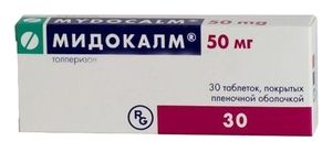 Показания к применению— лечение патологически повышенного тонуса и спазмов поперечно-полосатой мускулатуры, возникающих вследствие органических заболеваний ЦНС (поражение пирамидных путей, рассеянный склероз, мозговой инсульт, миелопатия, энцефаломиелит); — лечение повышенного тонуса и мышечных спазмов, мышечных контрактур, сопровождающих заболевания органов движения (например, спондилез, спондилоартроз, цервикальные и люмбальные синдромы, артрозы крупных суставов); — восстановительное лечение после ортопедических и травматологических операций; — в составе комбинированной терапии облитерирующих заболеваний сосудов (облитерирующий артериосклероз, диабетическая ангиопатия, облитерирующий тромбангиит, болезнь Рейно, диффузная склеродермия); — в составе комбинированной терапии заболеваний, возникающих на основе нарушений иннервации сосудов (акроцианоз, интермиттирующая ангионевротическая дисбазия); — болезнь Литтла (детский церебральный спастический паралич) и другие энцефалопатии, сопровождающиеся мышечной дистонией.Применение при беременности и кормлении грудьюВвиду отсутствия данных о применении при беременности и в период грудного вскармливания назначение препарата Мидокалм в эти периоды не рекомендуется.Противопоказания— миастения; — детский возраст до 3 лет; — повышенная чувствительность к любому из компонентов препарата.Побочное действиеСо стороны центральной и периферической нервной системы: мышечная слабость, головная боль. Со стороны сердечно-сосудистой системы: артериальная гипотензия. Со стороны пищеварительной системы: тошнота, рвота, чувство дискомфорта в животе. Аллергические реакции: редко — кожный зуд, эритема, крапивница, ангионевротический отек, анафилактический шок, бронхоспазм. При уменьшении дозы побочные реакции обычно проходят.СоставТолперизона гидрохлорид 50 мг Вспомогательные вещества: лимонной кислоты моногидрат — 0.73 мг, кремния диоксид коллоидный — 0.8 мг, стеариновая кислота — 1.7 мг, тальк — 4.5 мг, целлюлоза микрокристаллическая — 14 мг, крахмал кукурузный — 29.77 мг, лактозы моногидрат — 48.5 мг. Состав пленочной оболочки: кремния диоксид коллоидный — 0.045 мг, титана диоксид (E171) — 0.244 мг, лактозы моногидрат — 0.392 мг, макрогол 6000 — 0.392 мг, гипромеллоза — 3.927 мг.Взаимодействие с другими препаратамиДанных о взаимодействии, ограничивающем применение препарата Мидокалм, не имеется. Хотя толперизон оказывает действие на ЦНС, препарат не вызывает седативного эффекта, поэтому возможно применение в комбинации с седативными, снотворными средствами и препаратами, содержащими этанол. Не влияет на действие этанола на ЦНС. При одновременном применении Мидокалм усиливает действие нифлумовой кислоты, поэтому при необходимости применения данной комбинации может потребоваться снижение дозы нифлумовой кислоты. Средства для общей анестезии, периферические миорелаксанты, психотропные препараты, клонидин усиливают эффект толперизона.