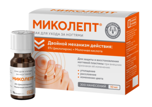 Лак для ухода за ногтями с признаками поражения грибком Миколепт специально разработан и предназначен для восстановления и защиты ногтевой пластины, поврежденной в результате грибкового поражения (онихомикоз). Применяется в тех случаях, когда пораженный участок составляет 1/2 и менее ногтевой пластины. При более обширных поражениях необходимо обратиться к врачу дерматологу.Уникальный двойной механизм действия за счет циклопирокса и молочной кислоты: прекращает рост и размножение грибов, восстанавливает здоровую ногтевую пластину, обеспечивает защиту от заражения грибком.