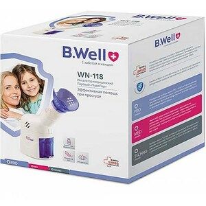 Для лечения верхних дыхательных путейПрибор образует облако пара с размером частиц более 10 микрон, которые воздействуют на верхние дыхательные путиЭффективная помощь при насморке, фарингите, ларингитеОтвары трав, эфирные маслаПаровой ингалятор B.Well создает пар с размером частиц более 10 мкм для лечения верхних дыхательных путей и ухода с отварами трав, эфирными маслами, минеральной и морской водойМягкий пар 43°СИнгалятор B.Well поддерживает комфортную температуру пара 43°С. Пар такой температуры не обжигает, благотворно влияет на кожу и эффективен при лечении.SPA для лицаВ комплекте парового ингалятора B.Well входит маска для косметических процедур с лечебным паромДва температурных режимаКомфортно для детей и взрослыхВысокая степень безопасностиДля процедуры требуется совсем немного воды, которая надежно закрыта в специальном резервуаре — нет риска пролить кипятокАвтоматическое отключениеПитание от сетиТехнические характеристики:Ингалятор медицинский WN-118 компании B.WellC устройством B.Well WN-118 можно проводить ингаляции водными растворамилекарств, минеральной водой, отварами, настоями трав и аромамаслами.ТЕХНИЧЕСКИЕ ХАРАКТЕРИСТИКИМетод распыления: Паровой ингаляторРабочее напряжение: 220 В, 50 ГцМакс. емкость распылителя: 80 млОбъем резервуара нагревателя: 20 млРазмер частиц: более 10 микронВес: около 560 гРазмеры прибора (Д × Ш × В): 23,5 × 9,0 × 26,0 (см)Время ожидания: 1 мин. ± 10 секундВремя работы: 7,5 мин. ± 30 секундРабочая температура и влажность: от +10° до +40°С,10% — 90%Температура и влажность хранения: от -20° до +70°С, 10% — 90%