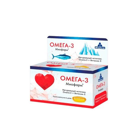 ОМЕГА 3 МИОФАРМ — Натуральный источник Омега-3 + Витамин Е Внешний вид и свойства: мягкие желатиновые капсулы, цвет: желтый, запах: специфический Для нормального функционирования сердечно-сосудистой системы важным является правильное питание, ограничивающие поступление в организм насыщенных жиров и холестерина, и достаточное потребление необходимых полиненасыщенных жирных кислот (ПНЖК) Омега-3. Омега-3 полиненасыщенные жирные кислоты способствуют снижению липопротеинов низкой плотности, нормализуют соотношение холестерина и триглицеридов в крови, что важно в комплексной профилактике заболеваний сердечно-сосудистой системы. Омега-3 тормозят процессы тромбообразования, нормализуют мозговое кровообращение, способствуют улучшению памяти, обладают противовоспалительным действием. Витамин Е предотвращает отложение холестерина в стенках сосудов, обеспечивает защиту клеток, положительно влияет на состояние суставов, улучшает использование белков организмом, способствует усвоению полиненасыщеных жирных кислот и витаминов А и D, стимулирует деятельность мышц, способствуя накоплению в них гликогена и нормализуя обменные процессы, повышает устойчивость эритроцитов к гемолизу. Содержание в суточной дозе (в 1 капсуле): Витамин Е 10 мг ПНЖК Омега-3 300 мг Пищевая ценность в 100 г продукта (в 1 капсуле): белки — 15,38 г (0,2 г), жиры — 73,08 г (0,95 г). Энергетическая ценность: ккал/кДж / 100 г (1 капсулу) — 719 (9,35) / 2965 (38,55).