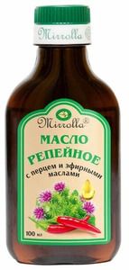 Репейное масло Мирролла — вся целительная сила репейного экстракта!Репейное масло «Мирролла» — популярное ввиду своей эффективности средство для восстановления волос и лечения кожи головы.Широкая линейка репейных масел «Мирролла» для всех типов волос выделяется среди аналогов уникальной технологией извлечения действующего вещества — инулина — из растительного субстрата (корня лопуха). Технология запатентована и применяется только в репейных маслах «Мирролла».Репейное масло «Мирролла» имеет 100% натуральный состав и удобно в применении. Масло приятно пахнет, не имеет красителей и легко смывается.– общее питание и укрепление корней волос;– восстановление поврежденной структуры волос;– регулирование работы сальных желез кожи головы;– устранение посеченности и придание живого блеска;– устранение шелушения кожи головы;– пробуждение и стимулирование «спящих» волосяных фолликул;– устранение сухости кожи и волос.Перец красный (жгучий) усиливает микроциркуляцию крови, способствуя быстрой доставке полезных компонентов репейника непосредственно к волосяным луковицам. Усиливает кровообращение вокруг волосяных луковиц; укрепляет корни волос, стимулирует их рост; насыщает корни волос витаминами.