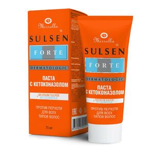 Паста «Mirrolla Sulsen FORTE»® с кетоконазолом — против перхотиДисульфид селена (сульсен) в составе пасты дополнен еще одним противоперхотным веществом — кетоконазолом. Средство не только обеспечивает надежную профилактику появления всех типов перхоти, но и придает волосам здоровый внешний вид. Паста дополняет и усиливает действие шампуня из линейки Forte.Основная функция кетоконазола — восстанавливать микрофлору кожи головы, что становится надежной защитой от появления перхоти. При этом компонент максимально мягко воздействует на локоны и эпидермис, не пересушивая их. Помогает успокоить эпидермис, справиться с неприятным зудом и шелушениями.В составе пасты присутствуют натуральные экстракты чистотела и корня лопуха – надежные помощники в восстановлении поврежденных волос. Средство при регулярном использовании поможет снизить активное выпадение волос, вернуть им здоровый блеск и эластичность.Действие Уменьшает проявление перхоти, снижает интенсивность зуда и успокаивает кожу головы, усиливает барьерные функции эпидермиса кожи головы, восстанавливает структуру волос.