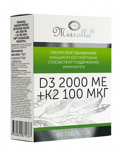 Главная » Аптека Mirrolla витамин D3 2000 МЕ + К2 100 Мкг Таблетки 60 шт Просмотров 9 Биологически активная добавка к пище, дополнительный источник витамина D3 и витамина К2. Препятствует вымыванию кальция из костной ткани, способствует поддержанию иммунитета. Мирролла