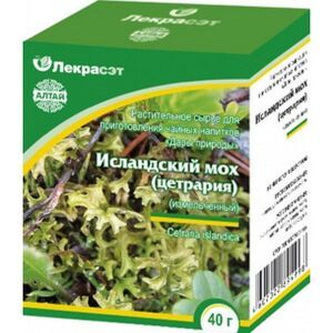 Растительное сырье для приготовления чайных напитков «Дары природы». Исландский мох обладает обволакивающим, тонизирующим и антибактериальным действием.Применяется при заболеваниях желудочно-кишечного тракта (атонии кишечника, гастрите, язве желудка, колите, хронических запорах) , заболеваниях кожи, при диарее. При лечение дыхательной системы (коклюша, астмы, простуд, бронхитов, пневмоний). Наружно лечение ран, ожогов, угрей и фурункулов.