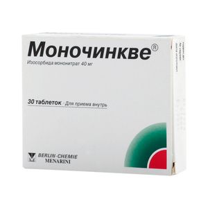 Показания к применению- профилактика приступов стенокардии у больных ИБС, в т.ч. после перенесенного инфаркта миокарда;- лечение хронической сердечной недостаточности (в составе комбинированной терапии).Применение при беременности и кормлении грудьюПо соображениям безопасности Моночинкве может применяться при беременности и в период лактации только строго по назначению врача, после тщательной оценки пользы и возможного риска, поскольку к настоящему моменту недостаточно данных о последствиях его применения у беременных и кормящих матерей.Если кормящая мать все же принимает Моночинкве, необходимо установить наблюдение за ребенком на предмет развития возможных эффектов от препарата.Противопоказания- острые нарушения кровообращения (шок, сосудистый коллапс);- острый инфаркт миокарда с выраженной артериальной гипотензией;- кардиогенный шок, если не обеспечивается достаточно высокое конечное диастолическое давление в левом желудочке путем применения внутриаортальной контрпульсации или за счет введения средств, оказывающих положительное инотропное действие;- токсический отек легких;- анемия (тяжелая форма);- выраженная артериальная гипотензия (систолическое АД менее 90 мм рт.ст., диастолическое АД менее 60 мм рт.ст.);- одновременный прием ингибиторов фосфодиэстеразы, в т.ч. силденафила, варденафила, тадалафила, поскольку они потенцируют антигипертензивное действие нитратов;- наследственная непереносимость галактозы, дефицит лактазы или синдром мальабсорбции глюкозы и галактозы;- детский и подростковый возраст до 18 лет (эффективность и безопасность не установлены);- повышенная чувствительность к нитратам или другим компонентам препарата.С осторожностью- гипертрофическая обструктивная кардиомиопатия, констриктивный перикардит, тампонада перикарда;- низкое давление наполнения при остром инфаркте миокарда, левожелудочковая недостаточность. Не следует допускать снижения систолического АД ниже 90 мм рт.ст.;- аортальный и/или митральный стеноз;- тенденция к ортостатическим нарушениям сосудистой регуляции;- глаукома (риск повышения внутриглазного давления);- тяжелая почечная недостаточность;- печеночная недостаточность (риск развития метгемоглобинемии);- геморрагический инсульт;- тиреотоксикоз;- заболевания, сопровождающиеся повышенным внутричерепным давлением;- недавно перенесенная черепно-мозровая травма.Состав1 таб.:Изосорбид-5-мононитрат 40 мг.Вспомогательные вещества: лактозы моногидрат — 160 мг, целлюлоза микрокристаллическая — 82.5 мг, крахмал кукурузный — 10 мг, тальк — 5 мг, магния стеарат — 2.5 мг.