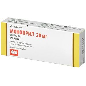 Показания к применению- артериальная гипертензия (монотерапия или в комбинации с другими гипотензивными средствами, в частности с тиазидными диуретиками);- сердечная недостаточность (в составе комбинированной терапии).Применение при беременности и кормлении грудьюМоноприл противопоказан при беременности. Применение препарата во II и III триместрах беременности вызывает повреждение или гибель развивающегося плода. Поскольку фозиноприлат выделяется с грудным молоком, при необходимости применения Моноприла в период лактации грудное вскармливание следует прекратить.За новорожденными, матери которых принимали ингибиторы АПФ при беременности, рекомендуется проводить тщательное наблюдение для своевременного выявления артериальной гипотензии, олигурии и гиперкалиемии.Моноприл противопоказан при беременности. Применение ингибиторов АПФ при беременности может вызвать нарушение развития или гибель плода. Если беременность установлена на фоне лечения препаратом Моноприл, его следует как можно быстрее отменить. Если (в редких случаях) альтернативы ингибиторам АПФ для лечения пациентки нет, следует проинформировать ее о потенциальном вреде лечения для развития плода и провести тщательное ультразвуковое исследование на предмет выявления патологии плода. При обнаружении олигогидроамниона лечение препаратом Моноприл не отменяют только в том случае, если оно проводится по жизненным показаниям. Следует, однако, иметь в виду то, что олигогидроамнион иногда обнаруживается только при наличии необратимых повреждений у плода.У новорожденных, матери которых принимали ингибиторы АПФ во время беременности, отмечались артериальная гипотензия, олигоурия, гиперкалиемия.Новорожденные, матери которых принимали ингибиторы АПФ во время беременности, должны быть тщательно обследованы в отношении гипотензии, олигурии и гиперкалиемии. Если у новорожденного отмечается олигурия необходимо направить усилия на контроль АД и поддержку почечной перфузии. Заменное переливание крови или диализ могут быть необходимы для восстановления АД и замещения нарушенной функции почек. Фозиноприл медленно выводится из циркулирующей крови у взрослых при проведении гемодиализа и перитонеального диализа. Опыта по выведению фозиноприла из циркулирующей крови у новорожденных нет.Поскольку фозиноприл обнаруживается в грудном молоке, препарат не следует применять в период кормления грудью.СоставФозиноприл натрия 20 мгвспомогательные вещества: лактоза безводная — 126 мг, целлюлоза микрокристаллическая — 40 мг, кросповидон — 7 мг, повидон — 4 мг, натрия стеарилфумарат — 3 мг.