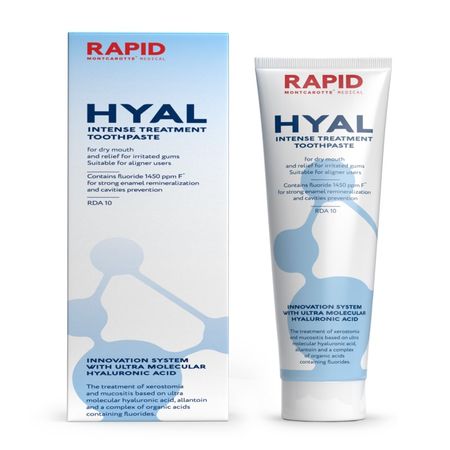Линейка RAPID HYAL – это специально разработанные продукты для защиты и регенерации слизистой оболочки полости рта, интенсивного лечения сухости во рту, облегчения раздражения десен, ускорения заживления язв во рту, реминерализации эмали и предотвращения кариеса. Зубная паста RAPID HYAL разработана специально стоматологами для защиты и поддержания увлажненности слизистой полости рта, рекомендована людям, имеющим проблему сухости во рту или при риске ее возникновения. Она также идеально подходит для пользователей элайнеров, ускоряет процесс адаптации мягких тканей к наличию кап в полости рта, эффективно очищает зубы и поверхность элайнеров, не вызывает раздражения слизистой и хорошо освежает полость рта. Уникальный состав зубной пасты включает ультрамолекулярную гиалуроновую кислоту, которая является мощным антиоксидантом и обеспечивает увлажнение тканей. Уникальный кополимер ВП/ВА формирует защитный барьер на слизистой оболочке, а аллантоин способствует быстрой регенерации клеток и обладает обезболивающими свойствами. Наличие фтора 1450 ppm F помогает предотвращать кариес, образование зубного камня. Паста обладает кровоостанавливающим, антибактериальным и противовоспалительным эффектом. RAPID HYAL бережно и эффективно очищает поверхность эмали от налета, восстанавливает зубную эмаль, снижает чувствительность зубов. Помогает предотвращать и облегчать оральный мукозит, а также уменьшить болевой синдром и улучшить процесс приема пищи. Состав RAPID HYAL абсолютно безопасен, без побочных эффектов. Имеет мягкую формулу, приятный вкус, не содержит масел, спирта, глицерина, парабенов, SLS, лимонена, ментола, и хорошо адаптируется к самой чувствительной слизистой оболочке полости рта. Подходит для взрослых и детей 7+, беременных, людей, проходящих химиотерапию и лучевую терапию, с сахарным диабетом I и II типа. RAPID HYAL — это исключительное средство, которое позволяет эффективно ухаживать за полостью рта, обеспечивая полноценный уход и комфортное состояние полости рта. НЕ СПОЛАСКИВАТЬ!