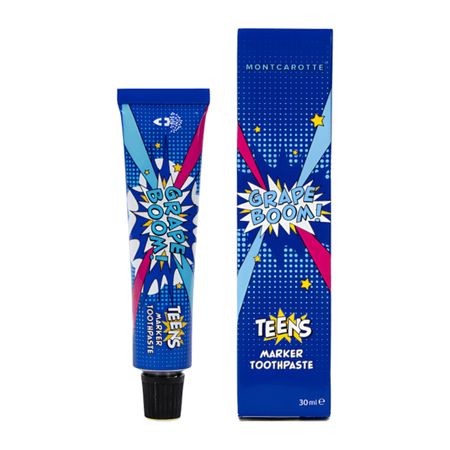 Зубная паста — маркер GRAPE BOOM Montcarotte САМЫЙ востребованный продукт для улучшения навыков гигиены полости рта у подростков и взрослых людей. Уникальный состав, который не имеет аналогов на рынке! Бунтарский дух, стремление к самостоятельности и независимости выбора образа жизни и питания — особенности подросткового периода, которые НЕ лучшим образом сказываются на мотивации к безупречной гигиене полости рта. Мы много наблюдали за подростками и точно знаем, как привлечь внимание молодых людей к гигиене полости рта. А еще учли все особенности здоровья, характера, моды и выпустили коллекцию средств для ухода за полостью рта MONTCAROTTE TEENS! Паста — маркер разработана специально как ШАГ НОМЕР 1 для идентификации зубного налета и ШАГ НОМЕР 2 для очищения и защиты зубов от кариеса. Индикатор в пасте окрашивает белковый след в налете, маркируя налет на зубах в ярко-голубой цвет во время чистки зубов, указывая ГДЕ ИМЕННО необходимо больше уделять внимания и тщательно чистить зубы. В течение первых трех минут чистки интенсивность цвета пасты изменяется, становится светлее, а еще через 10 минут нейтрализуется щелочью слюны.