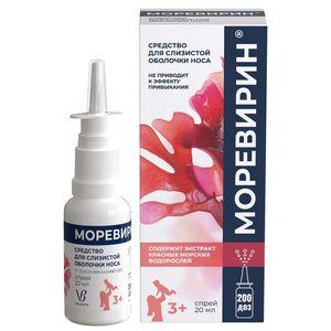 Средство для слизистой оболочки носа Моревирин® — изделие медицинского назначения.Внешний вид: прозрачная бесцветная или слегка желтоватая жидкость без запаха.Изделие предназначено для создания барьера на слизистой носа и используется для защиты от проникновения вирусов, попадающих в верхние дыхательные пути при вдыхании воздуха, и распространения вирусов по слизистой носа из уже инфицированных участков слизистой.Является профилактическим средством от ОРВИ (в том числе гриппа, Covid-19) и других простудных заболеваний.Применяется для защиты слизистой носа от первичного инфицирования и распространения вирусной инфекции при лечении ОРВИ и острых вирусных ринитов, вызванных ОРВИ, в составе комплексной терапии.Область применения — оториноларингология. Средство предназначено для ухода за полостью носа.Описание принципа действияКаррагинан (экстракт красных морских водорослей) образует защитный барьер против вирусов простуды и увлажняет слизистую оболочку носа. Каррагинан представляет собой природный полимер (полисахарид с молекулярной массой более 100 кДа), не проникающий в системный кровоток, после нанесения на слизистые оболочки дыхательных путей.Каррагинан покрывает защитной пленкой слизистую оболочку носа и действует в качестве физического барьера, препятствующего проникновению вируса в клетки. Каррагинан также связывается с белками вирусной оболочки, отвечающими за взаимодействие вируса со слизистой, тем самым также препятствуя его проникновению в клетки. При применении на уже инфицированных участках, каррагинан предотвращает распространение вируса по носоглотке, и, таким образом, снижает количество вирусных частиц в месте инфекции (вирусную нагрузку), уменьшая симптомы заболевания и риск передачи инфекции другому человеку.Основные технические и функциональные характеристики медицинского изделияСредство выпускается по ТУ 21.20.23-009-44241667-2021 с соблюдением международных и национальных стандартов.Средство выпускается во флаконах из коричневого стекла или флаконах пластиковых из полиэтилена высокой плотности, укупоренных навинчиваемой насадкой распыляющей с защитным колпачком. Распыление — «спрей».Требования к применению и эксплуатации медицинского изделияСредство предназначено для использования в лечебно-профилактических учреждениях и домашних условиях. Изделие полностью готово к использованию, технического обслуживания и ремонта не требует.Средство относится к изделиям индивидуального пользования. Проведение процедур с данным медицинским изделием в домашних условиях не требует специальной подготовки и специальных навыков.