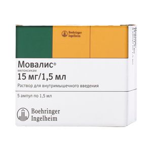 Показания к применениюСтартовая терапия и краткосрочное симптоматическое лечение при: — остеоартрите (артроз, дегенеративные заболевания сус тавов); — ревматоидном артрите; — анкилозирующем спондилите; — других воспалительных и дегенеративных заболеваниях костно- мышечной системы, таких как артропатии дорсопатии (например, ишиас, боль внизу спины, плечевой периартрит и другие), сопровождающихся болью.;Применение при беременности и кормлении грудьюПрименение препарата Мовалис противопоказано при беременности.; Известно, что НПВП проникают в грудное молоко, поэтому применение препарата Мовалис в период кормления грудью противопоказано.; Как препарат, ингибирующий синтез циклооксигеназы/ простагландина, Мовалис может оказывать влияние на фертильность, и поэтому не рекомендуется женщинам, планирующим беременность. Мелоксикам может приводить к задержке овуляции. В связи с этим у женщин, имеющих проблемы с зачатием и проходящим обследование по поводу подобных проблем, рекомендуется отмена приема препарата Мовалис.Противопоказания— гиперчувствительность к активному ингредиенту или вспомогательным компонентам препарата; — гиперчувствительность (в т.ч. к другим НПВП), полное или неполное сочетание бронхиальной астмы, рецидивирующего полипоза носа или околоносовых пазух, ангионевротического отека или крапивницы, вызванных непереносимостью ацетилсалициловой кислоты или других НПВП из-за существующей вероятности перекрестной чувствительности (в т.ч. в анамнезе); — эрозивно-язвенные поражения желудка и двенадцатиперстной кишки в фазе обострения или недавно перенесенные; — воспалительные заболевания кишечника (болезнь Крона или язвенный колит в стадии обострения); — тяжелая печеночная и сердечная недостаточность; — тяжелая почечная недостаточность (если не проводится гемодиализ, КК <30 мл/мин, а также при подтвержденной гиперкалиемии); — активное заболевание печени; — активное желудочно-кишечное кровотечение, недавно перенесенные цереброваскулярные кровотечения или установленный диагноз заболеваний свертывающей системы крови; — сопутствующая терапия антикоагулянтами, т.к. есть риск образования внутримышечных гематом; — терапия периоперационных болей при проведении шунтирования коронарных артерий; — беременность; — период лактации (грудного вскармливания); — возраст до 18 лет.;Состав1 ампула (1,5 мл) содержит: активное вещество: мелоксикам — 15,0 мг; ;вспомогательные вещества: меглюмин — 9,375 мг, гликофурфурол — 150 мг, полоксамер 188 -75 мг, натрия хлорид — 4,5 мг, глицин — 7,5 мг, натрия гидроксид — 0,228 мг, вода для инъекций — 1279,482 мг.;